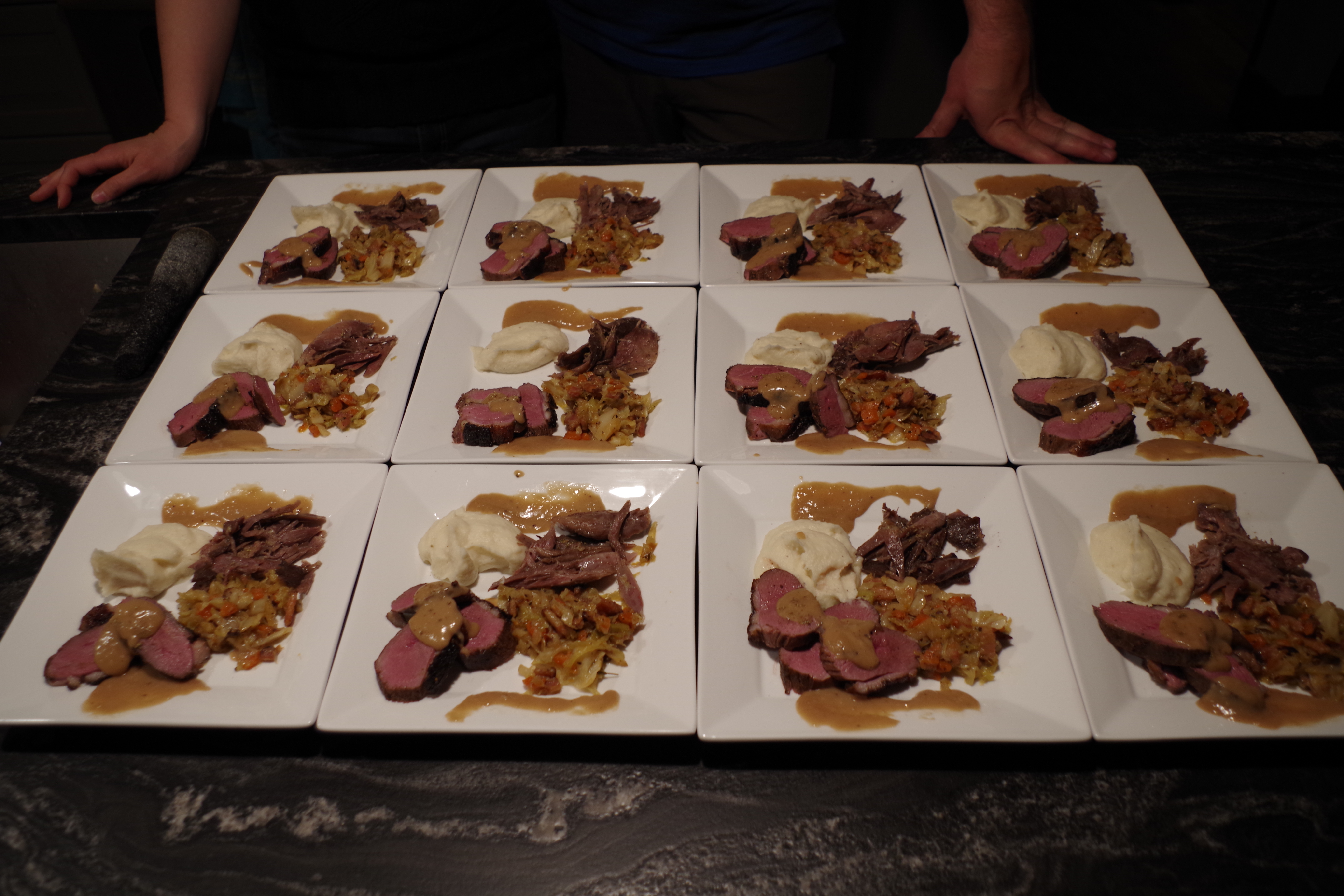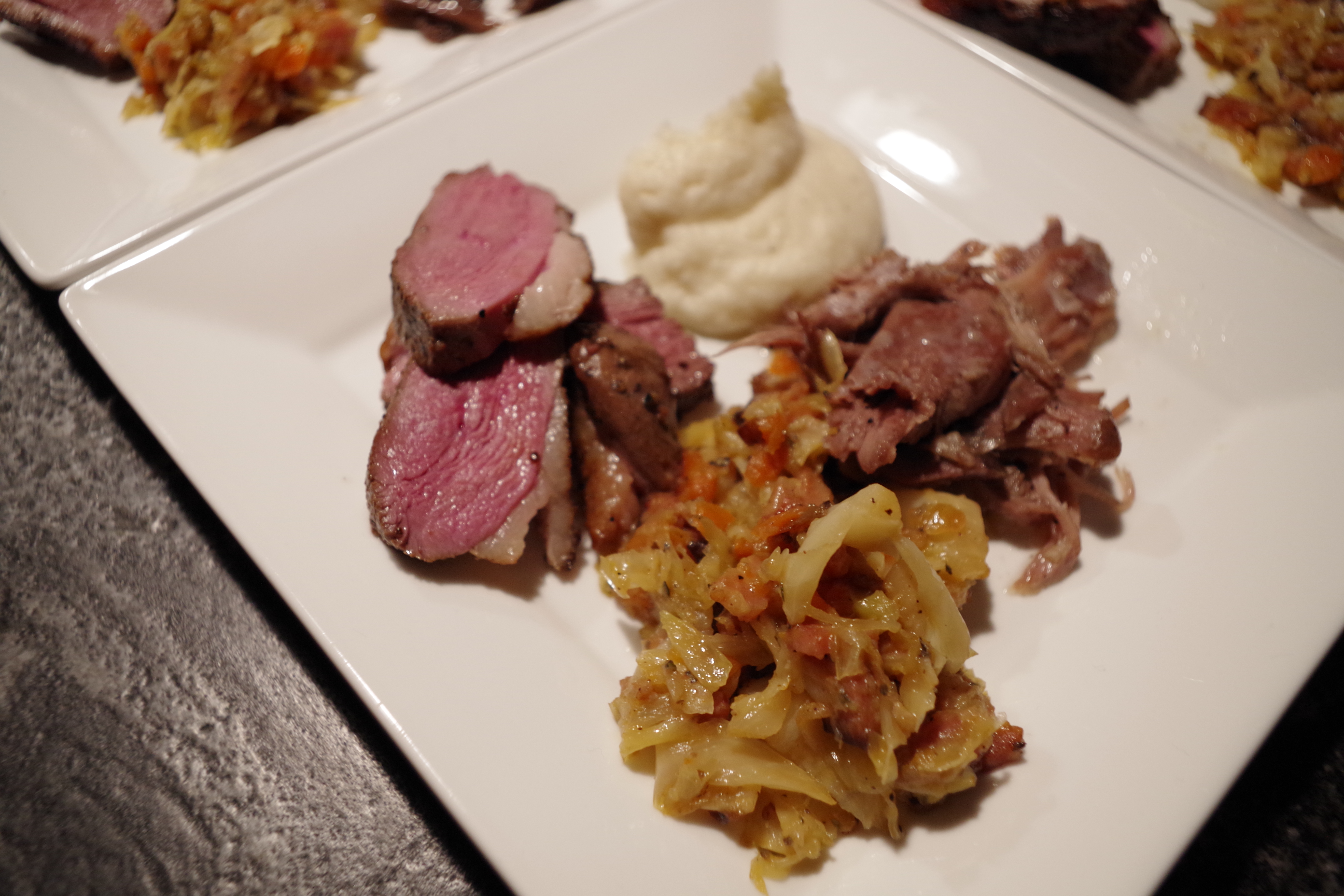 Magret et cuisse confite sous vide sauce au foie gras, purée de céleri-rave et embeurrée de choux style Pied de Cochon
